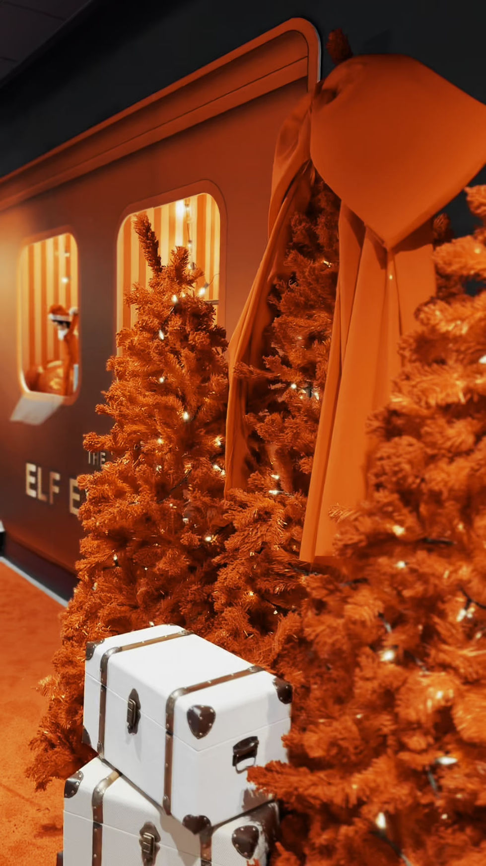 Designed exclusively for The Summit Birmingham’s annual Christmas celebration, The Elf Express is an immersive holiday photo op that brings the North Pole to life. Guests are welcomed by a vibrant train facade decked out in festive red, complete with glowing windows, playful elves, and snowy footprints leading the way. Inside, cozy scenes await—plaid-wrapped presents, golden cocoa pots, lush wreaths, and twinkling trees surround a warm leather sofa that feels like Santa’s personal lounge.